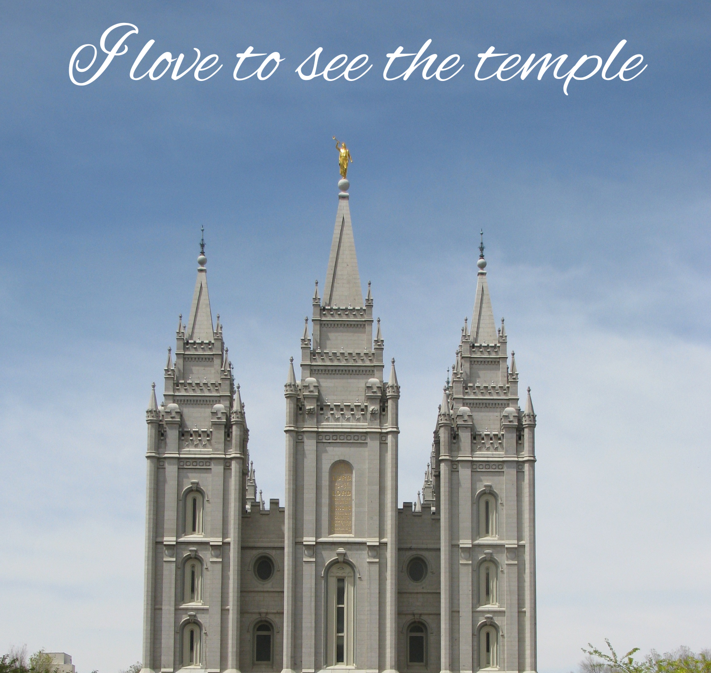 Photo of Salt Lake City temple with the words “I love to see the temple, I’m going there someday”. Several font variations.